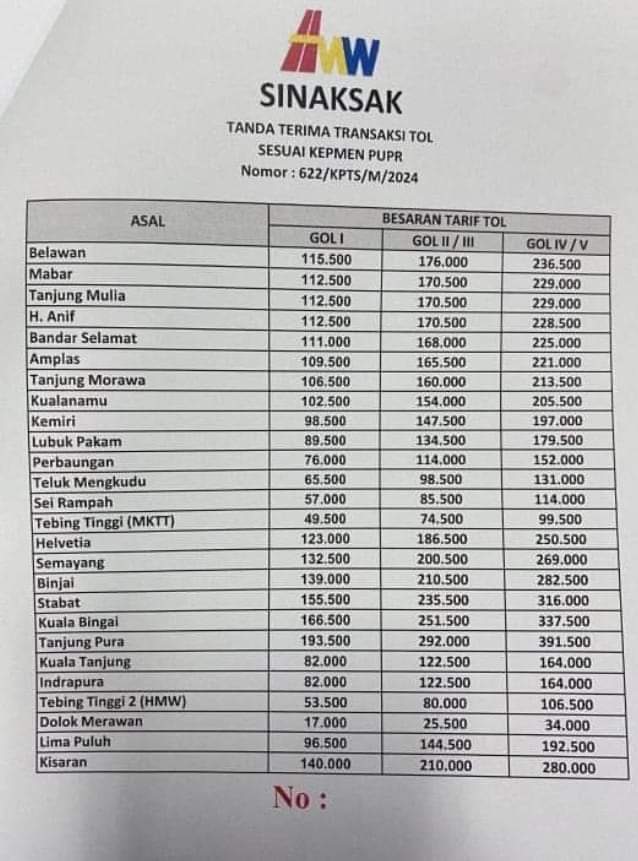 Pematangsiantar (Sumut), LIVESUMUT.com – Pemerintah melalui Kementerian Pekerjaan Umum dan Perumahan Rakyat (PUPR) telah menetapkan tarif resmi untuk jalan tol Sinaksak berdasarkan Kepmen PUPR No. 622/KPTS/M/2024.