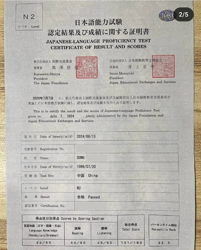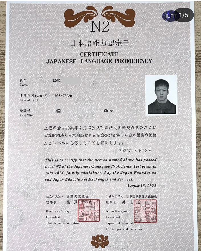 Dilansir dari akun Instagramnya, Jakku Song bahkan telah memperoleh Sertifikat Uji Kemampuan Bahasa Jepang atau Japanese Language Proficiency Test Certificate dengan skor N2, yang menunjukkan kemampuan untuk memahami bahasa Jepang dalam situasi sehari-hari dan berbagai keadaan secara cukup baik.