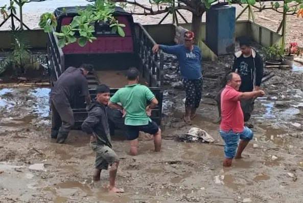 “Ada lima rumah terdampak. Material lumpur dan batu kecil masuk ke dalam rumah warga. Hujan deras yang turun semalam menyebabkan sungai di desa ini meluap, membawa material tanah dan batu hingga menyebabkan banjir bandang,” ungkap Iwan Simarmata.