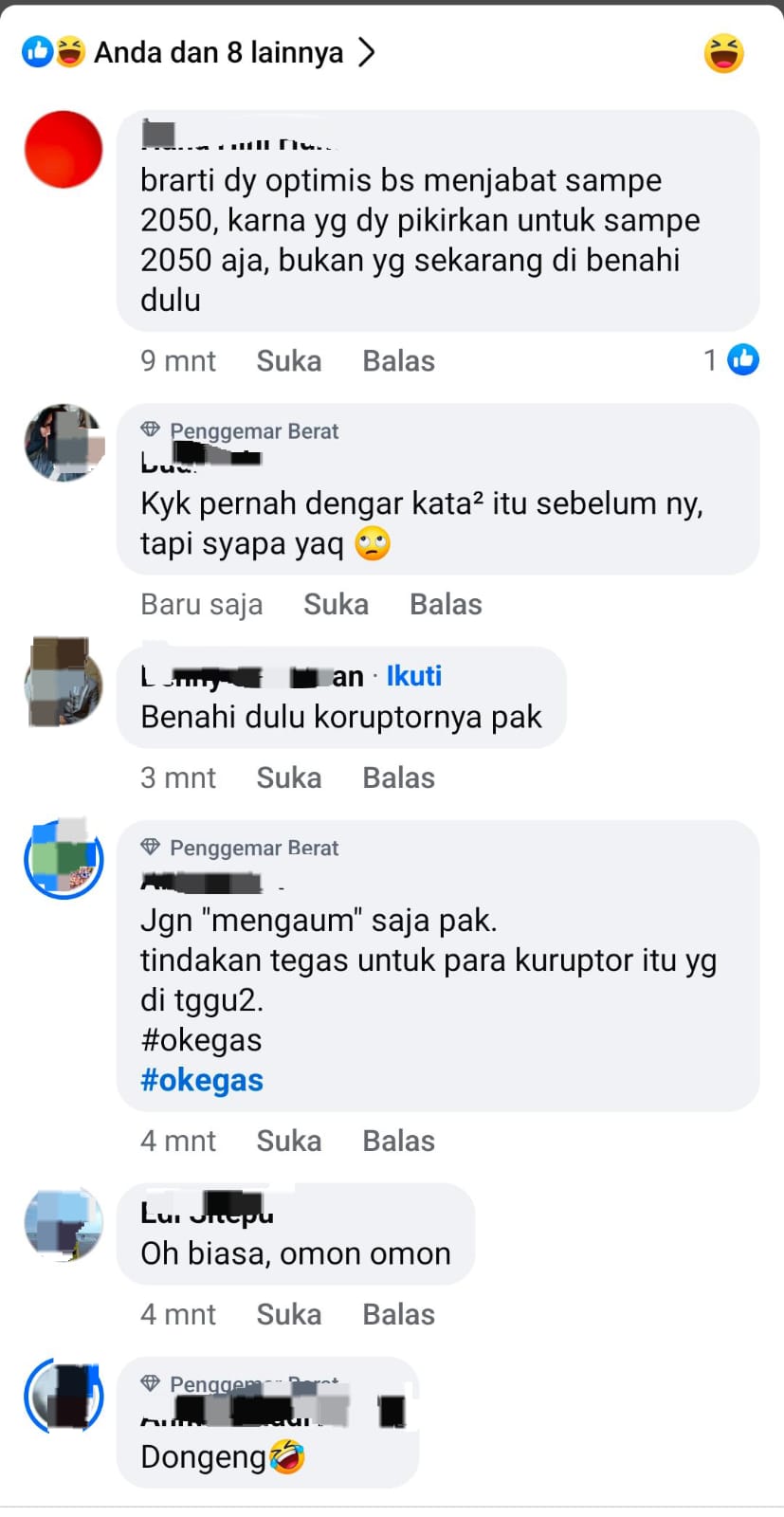 Akun Facebook Haha **** Huhu berkomentar “brarti dy optimis bs menjabat sampe 2050, karna yg dy pikirkan untuk sampe 2050 aja, bukan yg sekarang di benahi dulu”