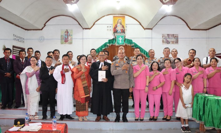Rombongan Kapolres disambut dengan hangat oleh Pimpinan Gereja HKBP Parjaratan, Pdt. Jhon V. Simbolon, M.Th., para sintua, serta jemaat gereja.