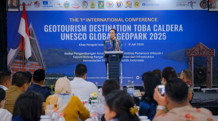 Kegiatan bertajuk The 1st International Conference: Geotourism Destination Toba Caldera UNESCO Global Geopark 2025 ini berlangsung secara offline dan online di Hall Khas Parapat, Selasa (8/7/2025), dan dibuka langsung oleh Menteri Pariwisata Widiyanti Putri Wardhana.