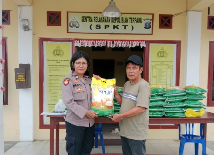 Pukul 11.00 WIB, personel Polsek yang dipimpin Kanit Binmas AIPTU Baren Panjaitan melakukan distribusi beras keliling sebanyak 50 zak (250 kg) menggunakan mobil patroli.
