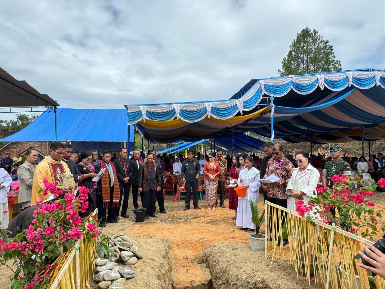 Umat Katolik bersama para tokoh masyarakat dan pemerintah daerah menghadiri peletakan batu pertama pembangunan Gereja Katolik Santa Maria Bunda Allah Aek Natolu, Paroki Santo Fidelis Parapat, Keuskupan Agung Medan.