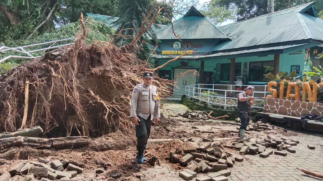 Kapolsek Siantar Barat, IPTU Raja Kaya Haloho, SH., MH., dalam keterangannya menyampaikan bahwa dari hasil monitoring ditemukan sebuah pohon tumbang yang menimpa kandang burung di dalam area Taman Hewan.