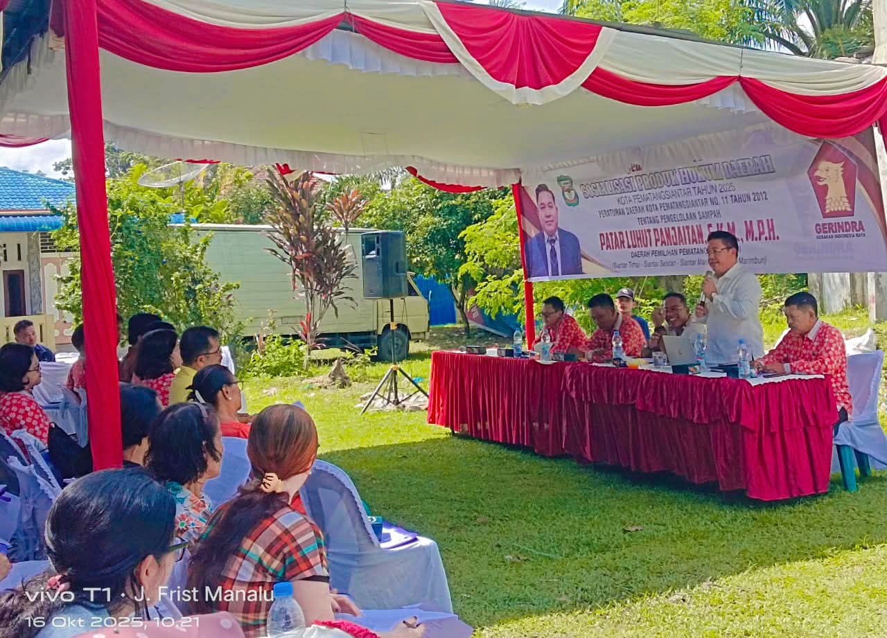 Pematangsiantar, LIVESUMUT.com — Anggota DPRD Kota Pematangsiantar dari Fraksi Gerindra, Patar Luhut Panjaitan, S.K.M., M.P.H., menggelar kegiatan Sosialisasi Peraturan Daerah (Sosper) di Jalan Parsoburan (Tamoni), depan Kantor Lurah Kristen, Kelurahan Kristen, Kecamatan Siantar Selatan, Kamis (16/10/2025).