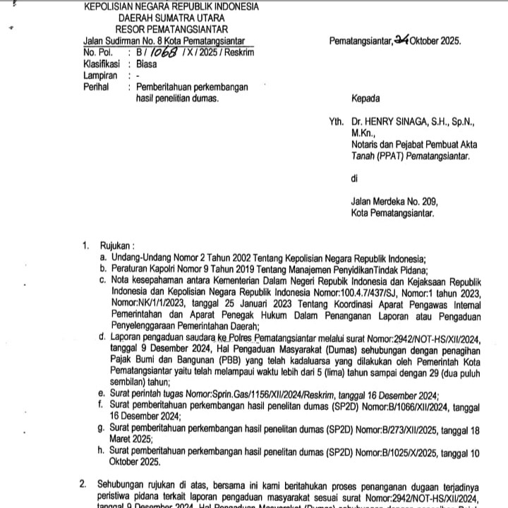 Terbaru, Notaris Dr. Henry Sinaga menerima surat resmi pemberitahuan perkembangan hasil penelitian pengaduan masyarakat (Dumas) dari Polres Pematangsiantar.