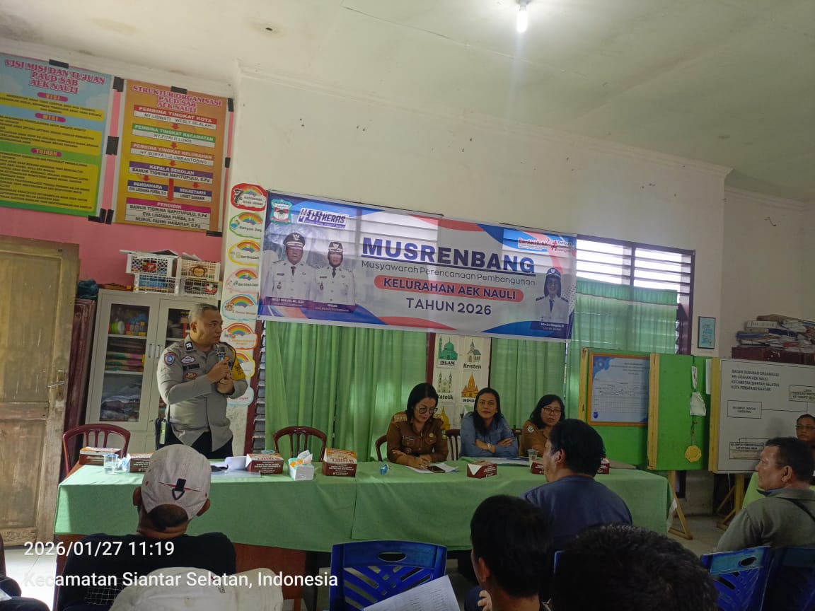 P. Siantar, LIVESUMUT.com – Bhabinkamtibmas Kelurahan Aek Nauli Polsek Siantar Selatan, AIPDA Herry Susanto Tarigan, SH, menghadiri kegiatan Musyawarah Perencanaan Pembangunan (Musrenbang) Tahun 2026 yang digelar di Kantor Kelurahan Aek Nauli, Kecamatan Siantar Selatan, Selasa (27/1/2026) pagi sekitar pukul 10.00 WIB.