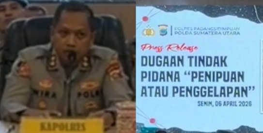 Dalam konferensi pers, Senin (06/04/2026), Kapolres Padangsidimpuan AKBP Dr. Wira Prayatna mengungkap, kasus ini merupakan dugaan tindak pidana penipuan dan/atau penggelapan dengan tersangka berinisial RL dan SHL.
